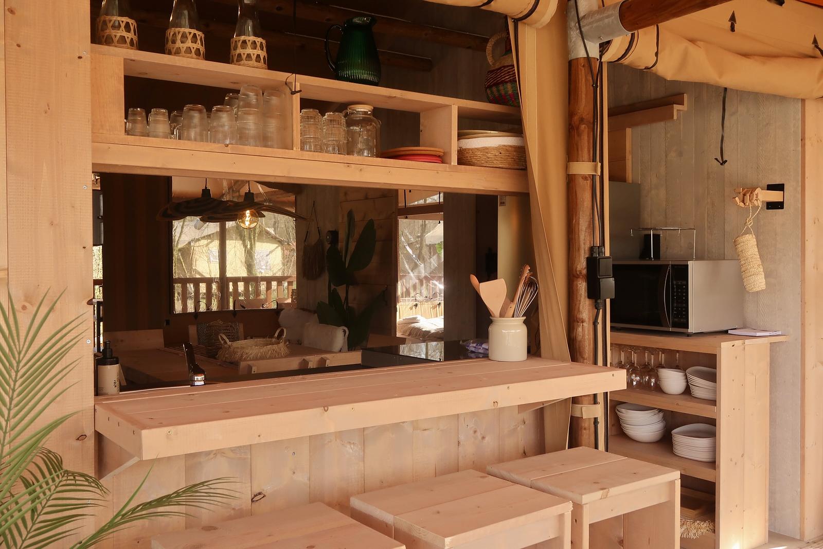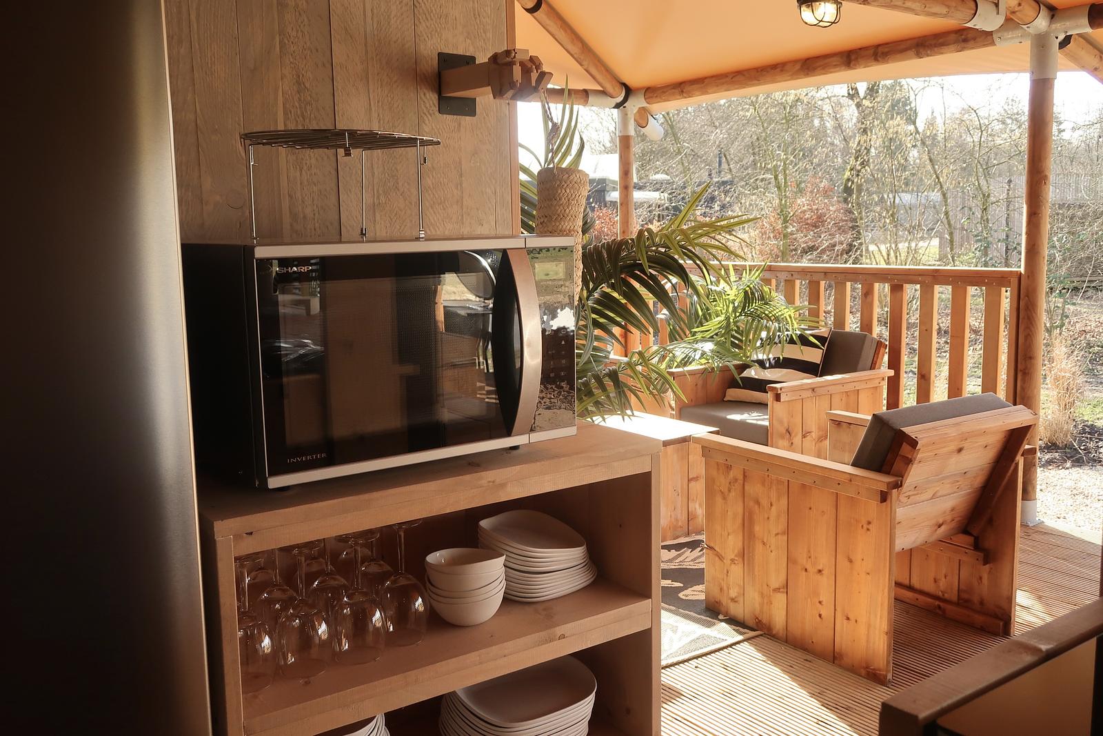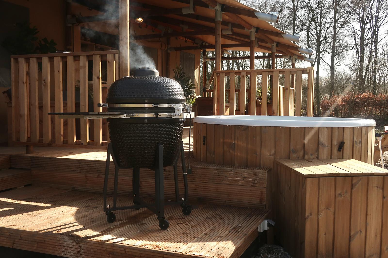 Een spectaculaire glamping accommodatie met eigen hout gestookte hottub en buitenkeuken!